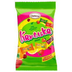 Карамель двухцветная, сочетающая натуральные сливки и фруктово-ягодные вкусы (малина, земляника, апельсин)